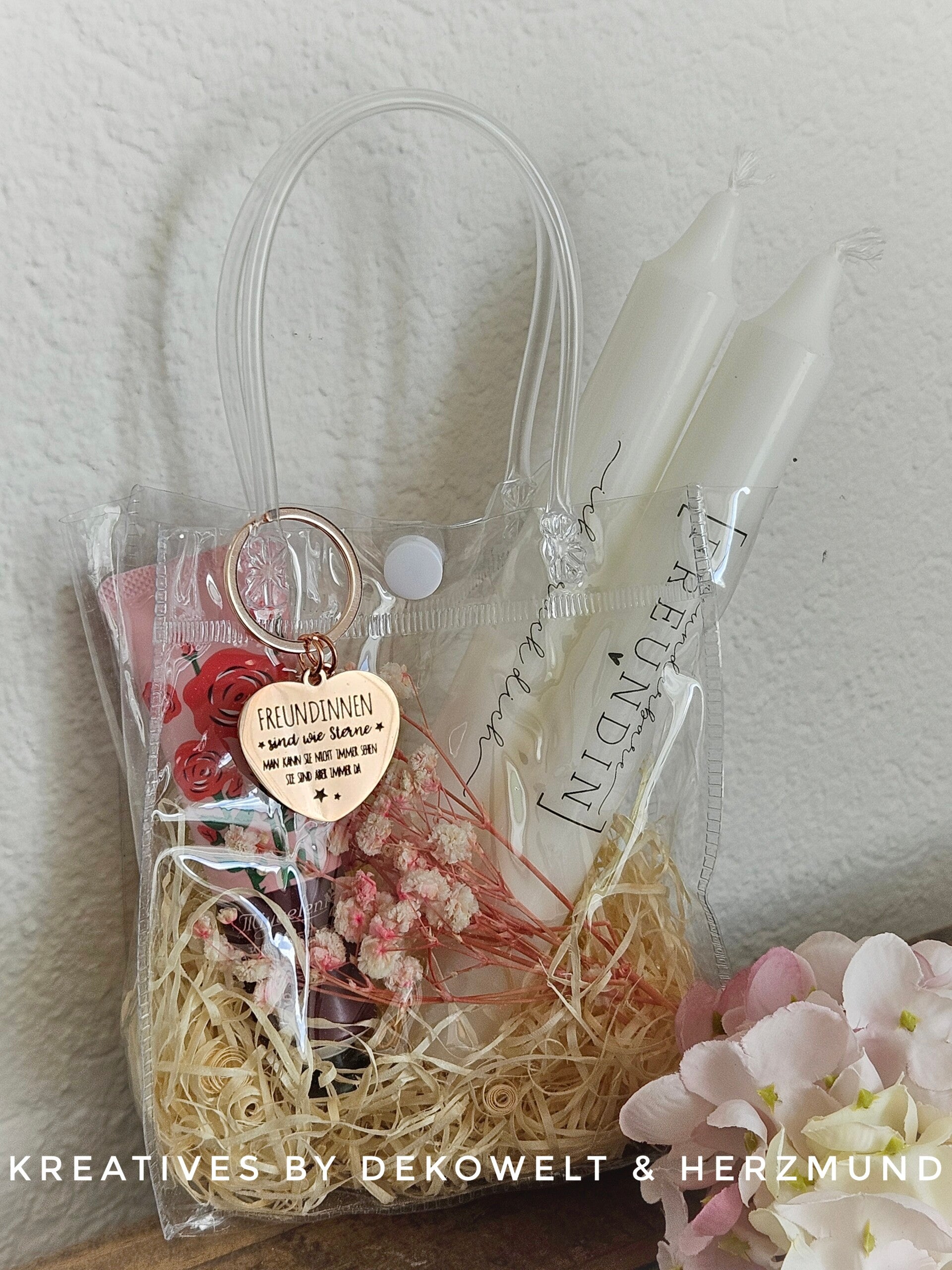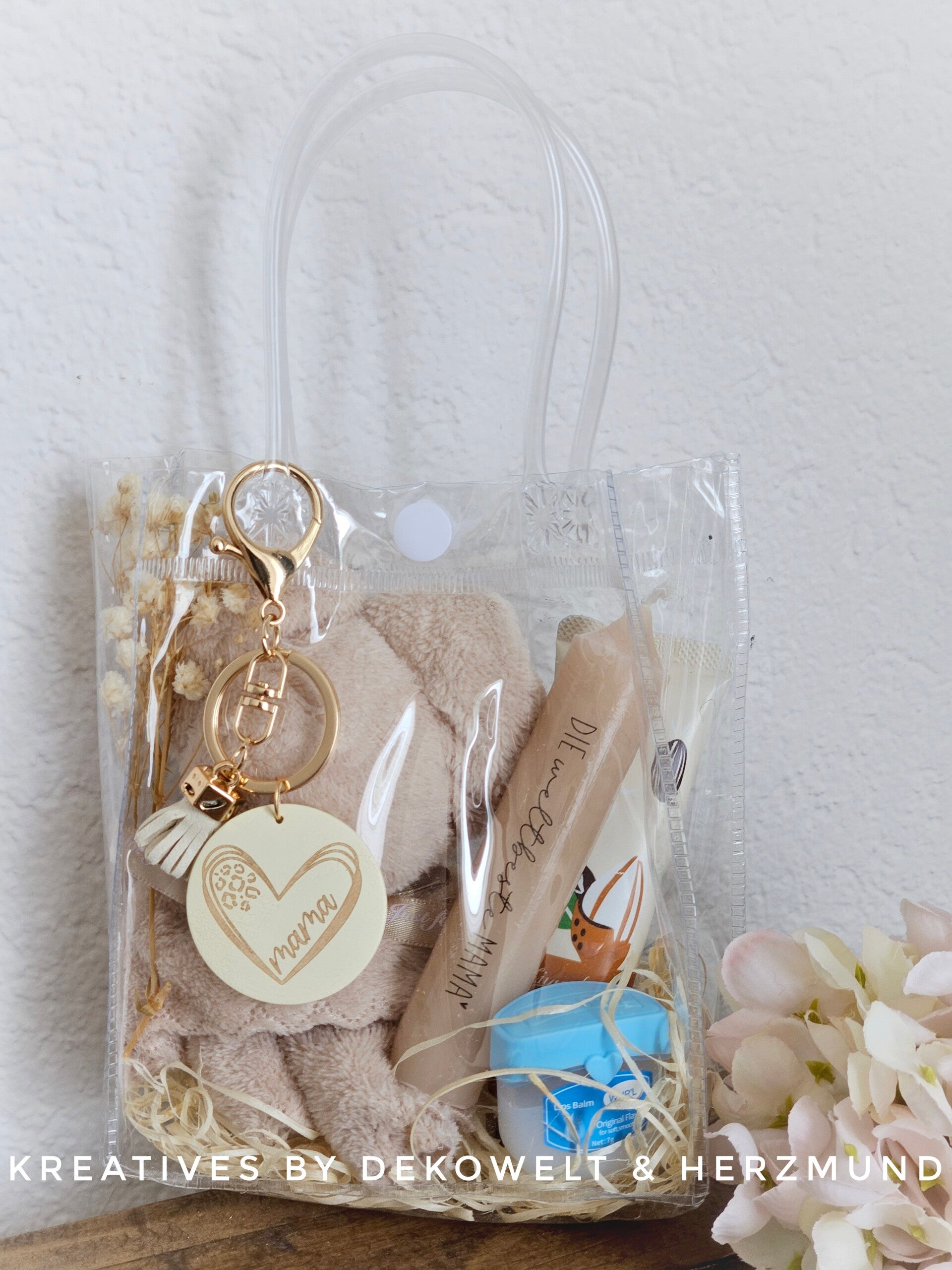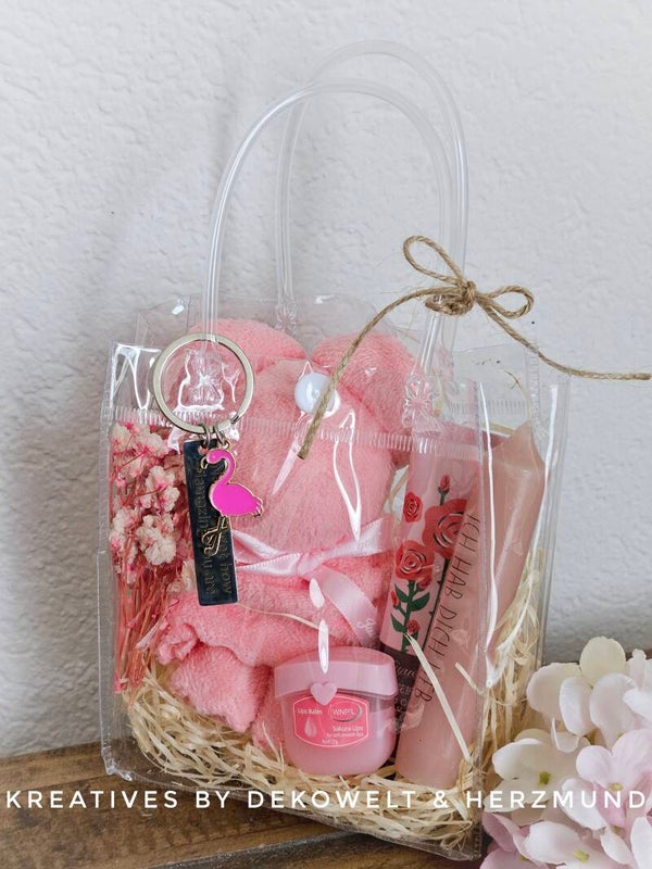 Tolle Beutel gefüllt mit Bär - Waschlappen, Handcreme, Lip Balsam, Kerze und Schlüsselanhänger. In verschiedenen Farben erhältlich.