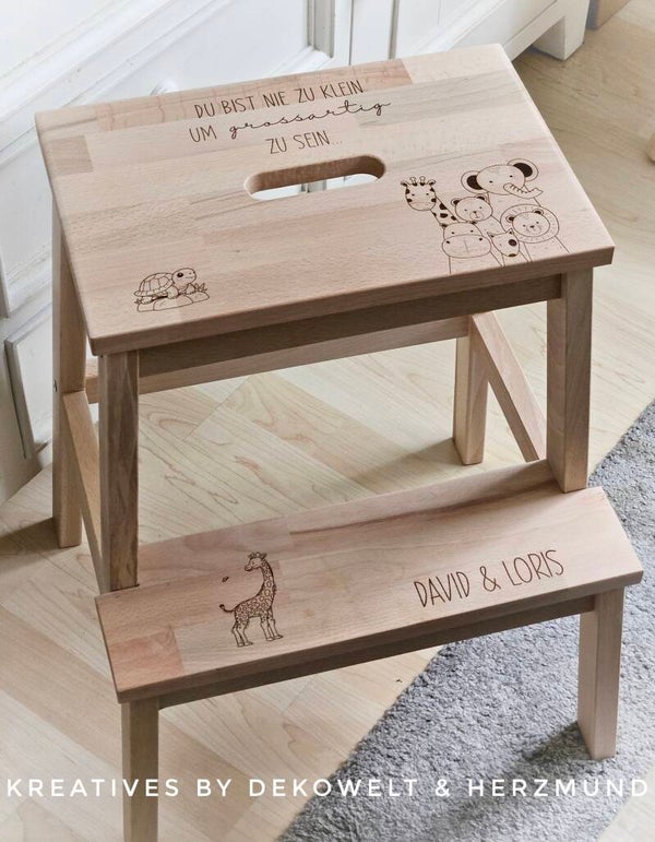Toller Tritthocker graviert mit Tieren und Spruch sowie Name...