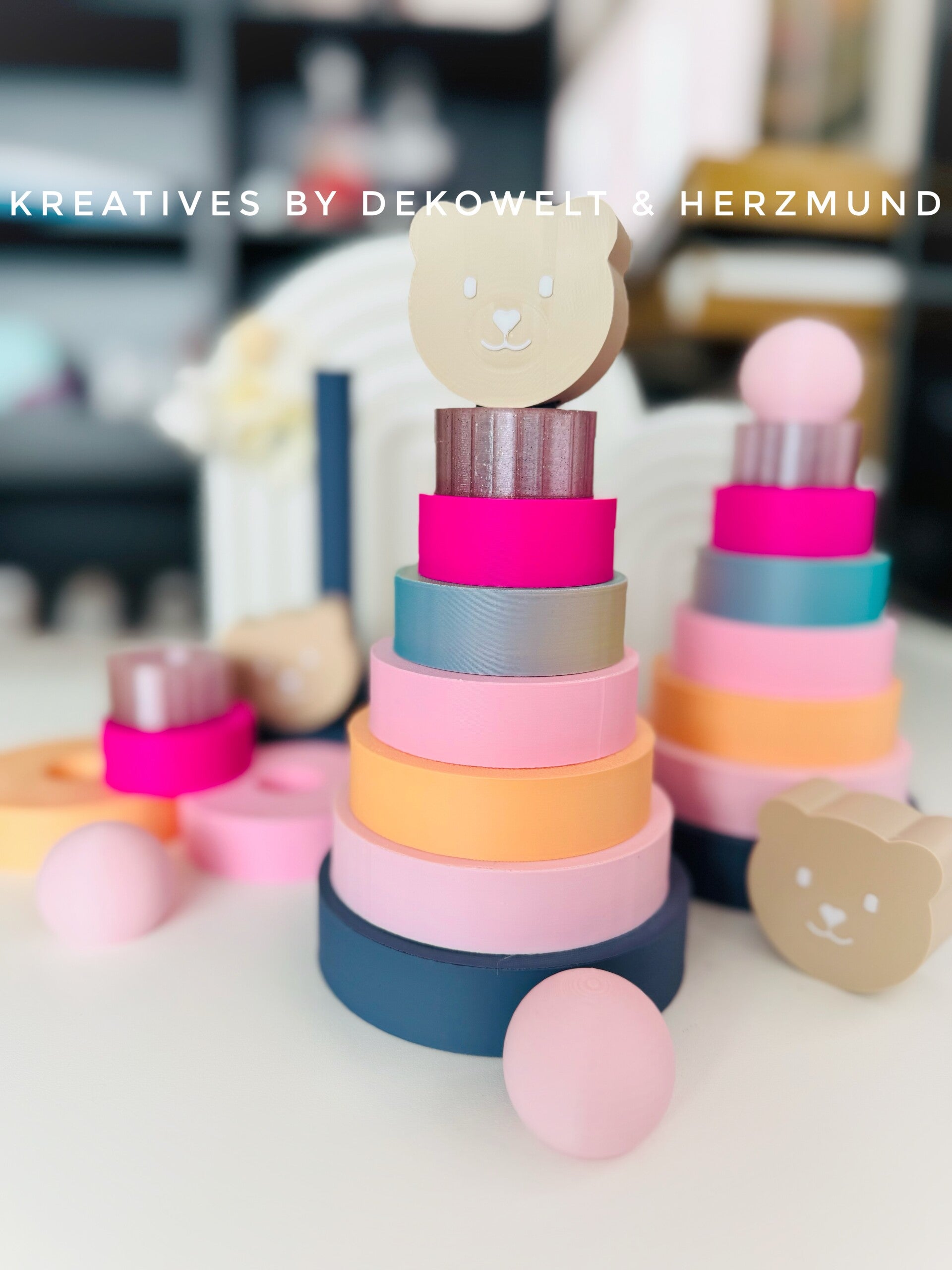 Dieser tolle Stapelturm zum spielen ist ein tolles Geschenk zur Geburt oder einfach so. Es gibt obendrauf eine Kugel und einen Bären. Farben dürfen gewünscht werden, ansonsten wird er wie auf dem Bild geliefert. Das Material PLA ist ungiftig und wird aus Mais gewonnen.