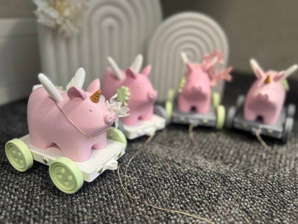 Dieses süsse Schweinhorn auf Rollwagen ist einfach ein tolles Geschenk für jeden Anlass...